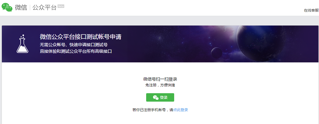 没有公众号的情况下,微信提供了测试公众号,可直接体验和测试公众平台一样的高级接口