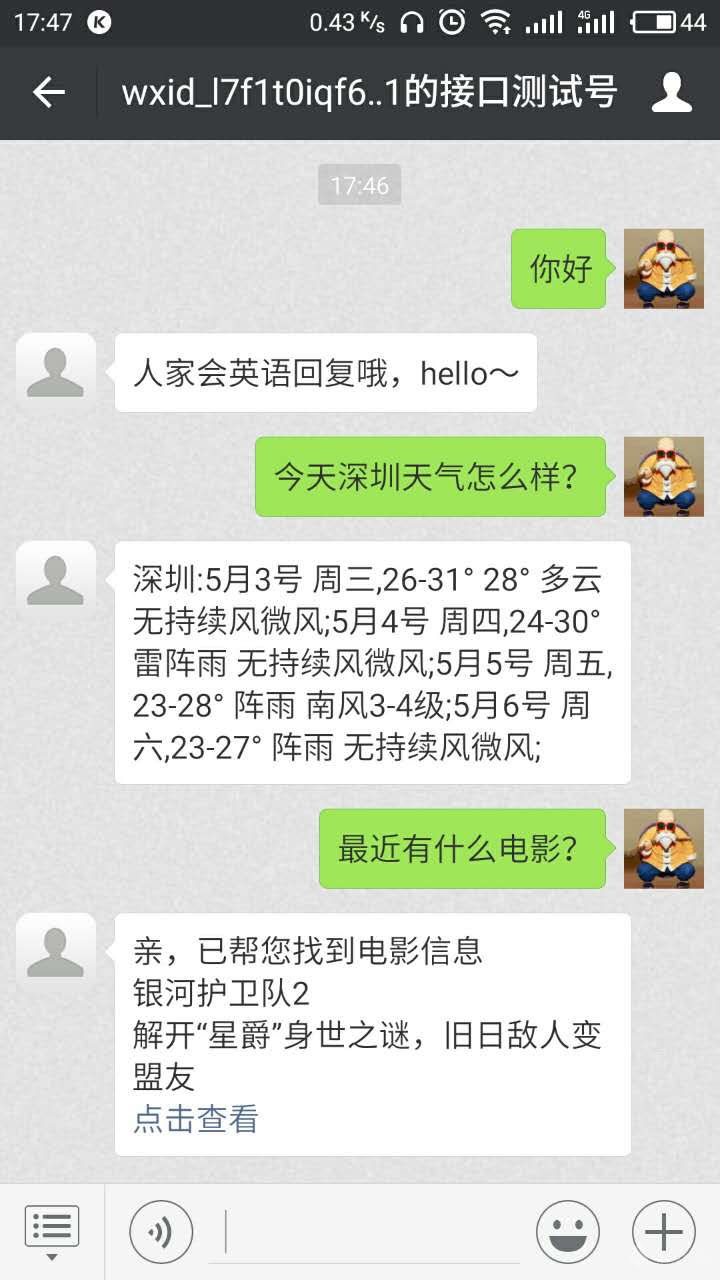 } 最后接入图灵机器人,需要在图灵注册获得key,这里用chat方